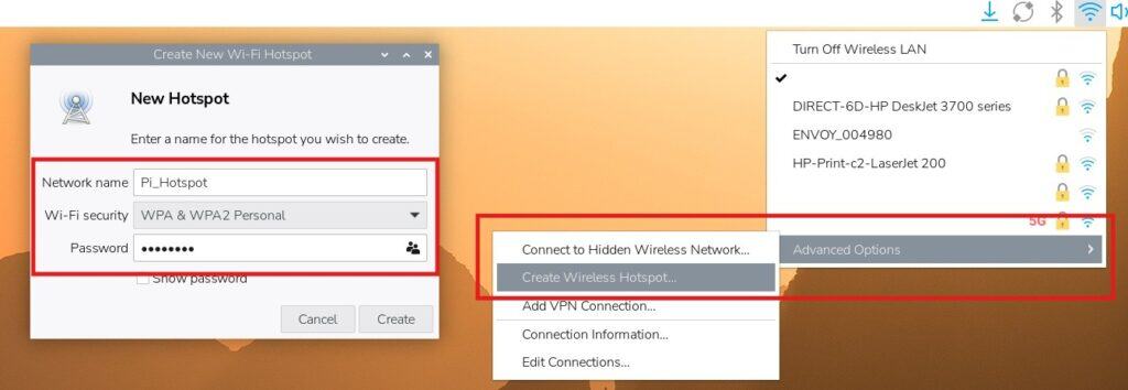 Los Puntos de Acceso Inalámbricos pueden ser habilitados en tu Raspberry Pi a través de la GUI y CLI usando Network Manager. Tus dispositivos pueden entonces conectarse a él usando Wi-Fi con el SSID y la Contraseña, como te conectarías a cualquier otro Punto de Acceso.