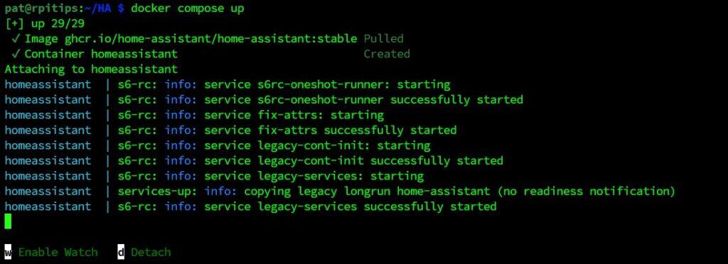 Solo espera un poco hasta que aparezca la interfaz de línea de comandos (CLI) de Home Assistant, y luego puedes ir directamente a la sección Getting Started with Home Assistant (omite la parte de Docker de este tutorial).