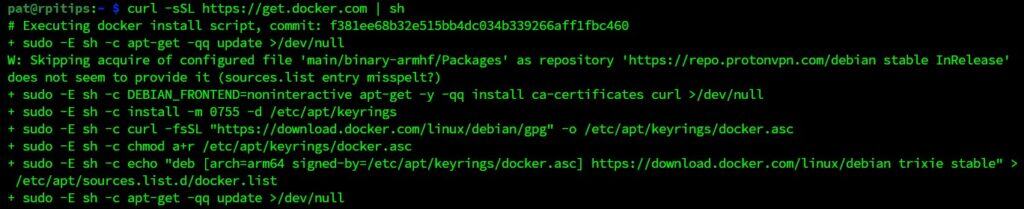 No necesitas usar sudo, el script lo hará por ti. Básicamente, este comando agregará un nuevo repositorio a tus fuentes APT e instalará los paquetes desde allí. Cuando termine, Docker iniciará su servicio automáticamente e imprimirá la versión.