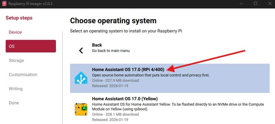 - OS – Navega a Other specific-purpose OS > Home Automation > Home Assistant, y selecciona Home Assistant OS.