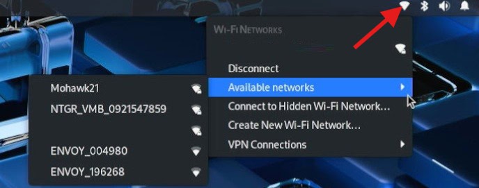 En el escritorio de Kali, haz clic en el ícono de red en la parte superior derecha y elige el SSID de tu red wifi.