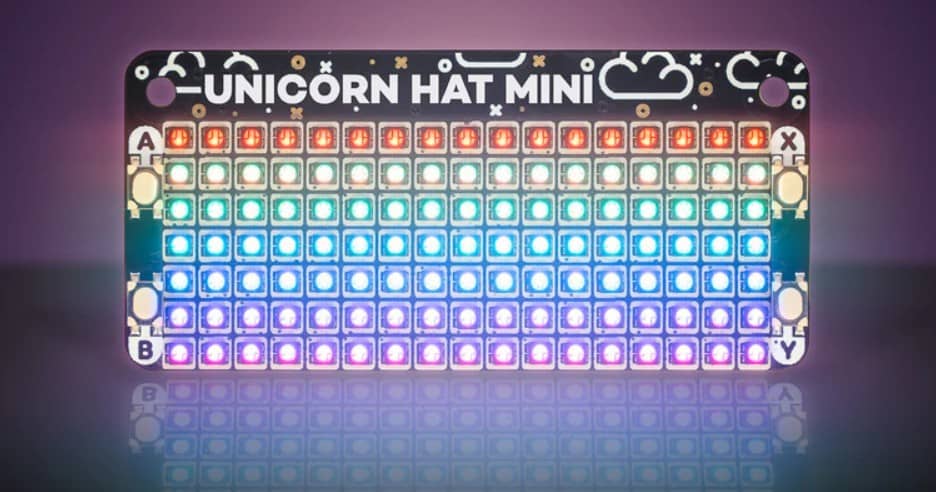 Con un nombre divertido, el Pimoroni Unicorn HAT Mini trae una pantalla de matriz LED RGB de 17 x 7 para decorar tu Raspberry Pi. También viene con una biblioteca de Python para programar la luz como quieras.